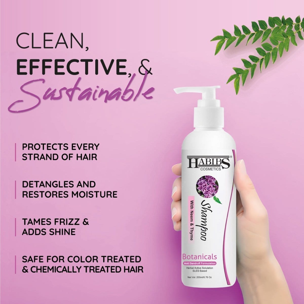 Discover the clean, effective, and sustainable secret to a healthy scalp and hair with Habibs Cosmetics Botanicals Shampoo. Our specialized anti-dandruff formulation, enriched with Neem, Thyme, and Basil oils, is designed to tackle dandruff, strengthen roots, and minimize hair loss, promoting truly healthy hair growth from a healthy scalp.